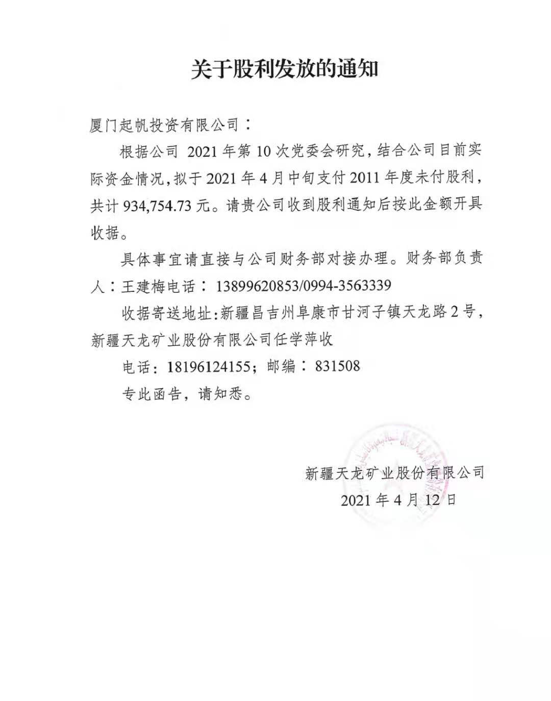 根据天龙矿业股份有限公司 2021年第10次党委会研究,拟于2021年4月中旬支付2011年度未付股利,共计934,754.73元,款到以短信通知,至此,2011年利润已分发完毕。2021/04/13